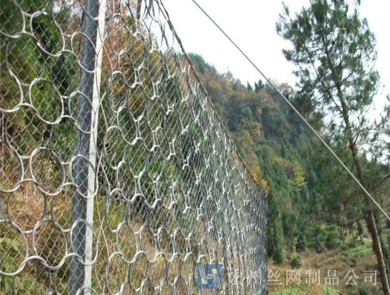 材質(zhì):鋼絲繩網(wǎng)、支撐繩和減壓環(huán)構(gòu)造:由鋼絲繩網(wǎng)或環(huán)形網(wǎng)(需攔截小塊落石時(shí)附加一層鐵絲格柵)、固定系統(tǒng)(錨桿、攔錨繩、基座和支撐繩)、減壓環(huán)和鋼柱四個(gè)主要部分構(gòu)成。